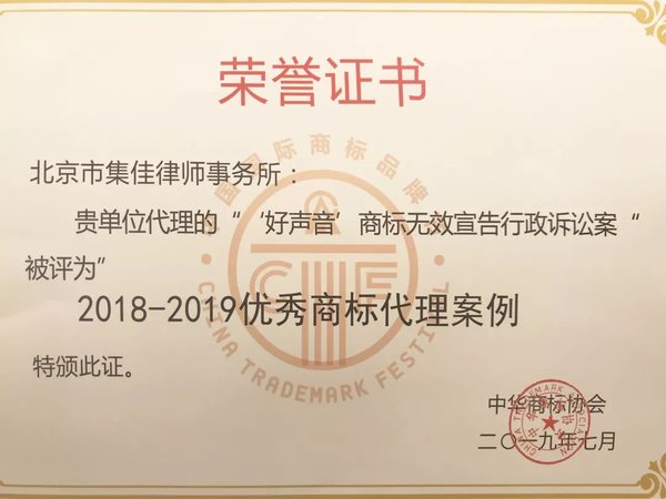 >欧陆娱乐>关于我们>荣誉概览>2019>集佳代理“好声音”商标无效宣告行政案入选“优秀商标代理案例”